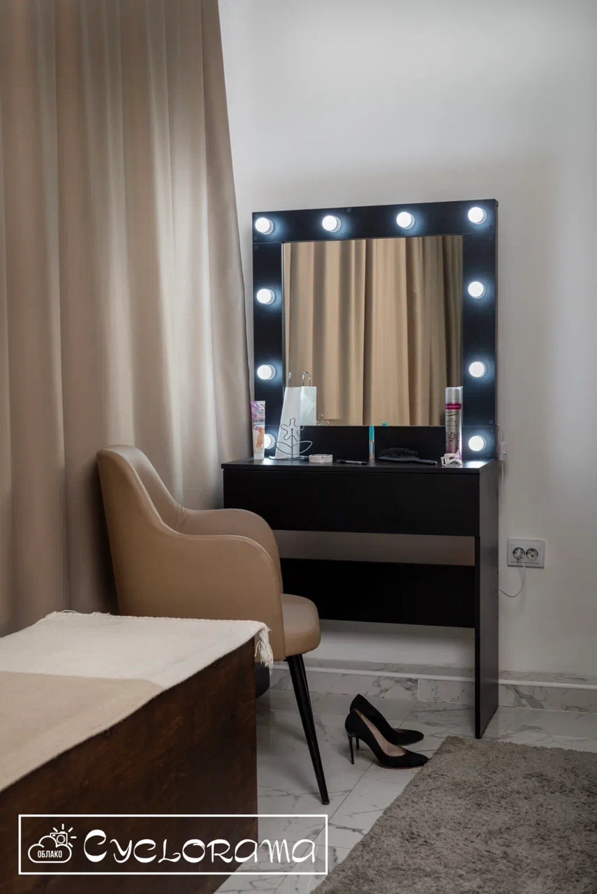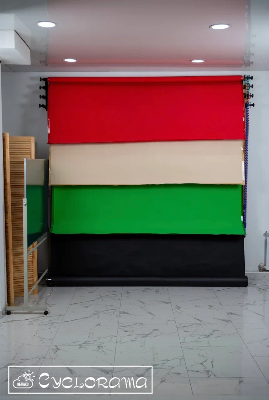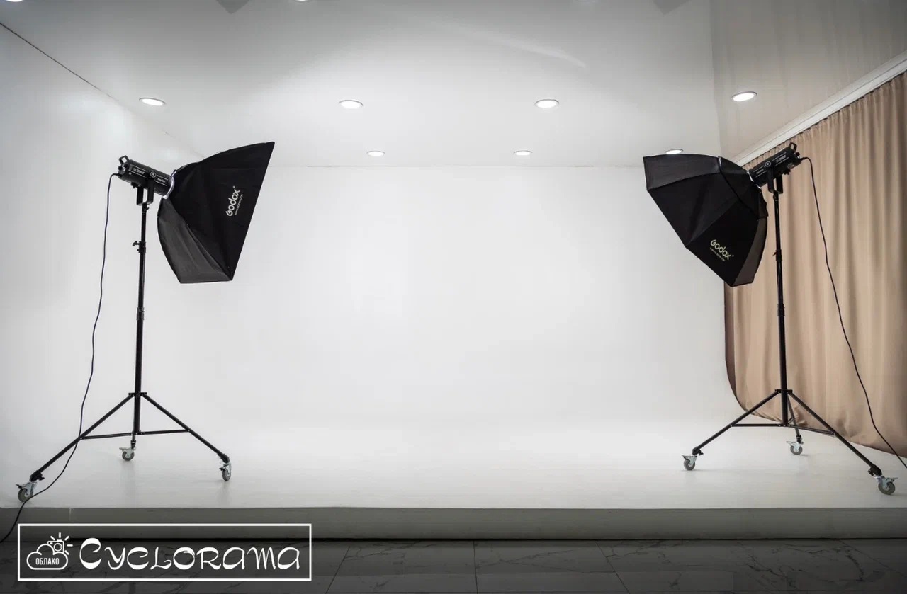 Просторная и светлая фотостудия Облако в Алматы. Главными плюсами студии: витражные окна, предоставляет оборудование, работает круглосуточно. Большая белая циклорама отлично подойдет для портретной фотосъемки.